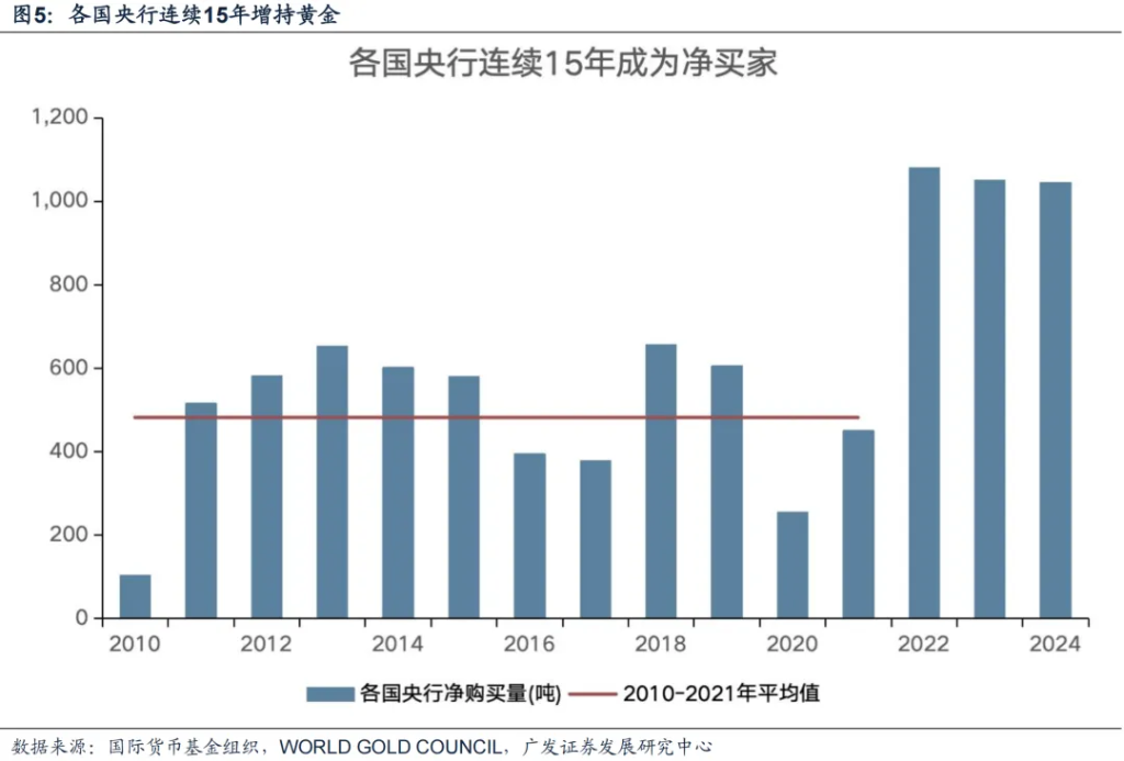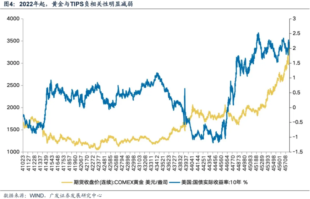 黄金可以近似看作长久期的通胀保值零息债券,而实际利率水平则构成其持有的隐性成本。但从走势来看:2022年左右开始相关性减弱。可能的原因:市场避险需求主导黄金定价、美元信用体系重构、央行购金行为改变供需结构、ETF资金流重塑市场结构等。