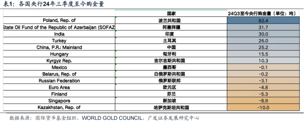 24年三季度至今,波兰、阿塞拜疆、印度、土耳其、中国央行增持黄金位列前5位,分别增持:82.4、31.7、30.0、26.0、25.2吨。