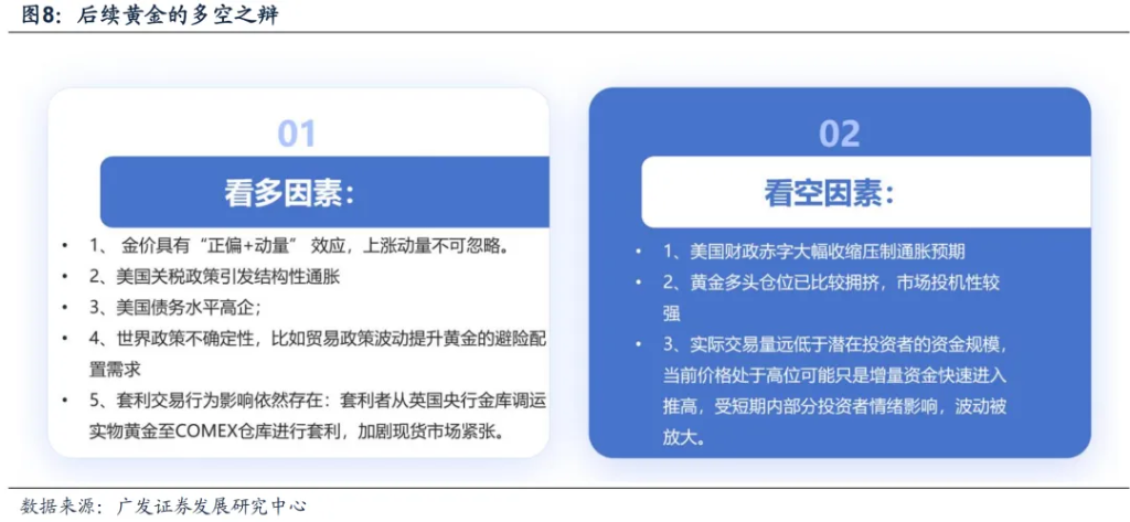 广发策略认为,黄金技术面触及周线级别超买区域,COMEX黄金投机净多头占比突破阈值区间,市场情绪过热特征显著。基于均值回归规律,黄金通过月线级别的价格修正完成流动性溢价再平衡,这也是此前短期驱动因素被过度透支后必要回归过程。