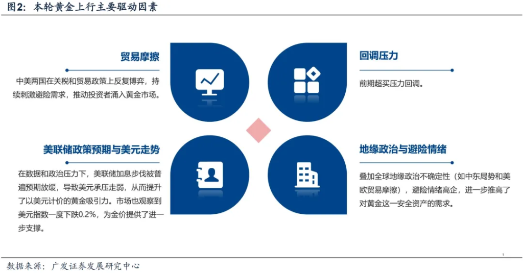 2025年4月关税政策落地后,黄金价格冲高回落近期呈剧烈波动态势。整体来看,本轮大涨主要受中美关税紧张升级、美元承压与美联储政策预期转向谨慎,以及全球避险情绪高企所驱动。底层逻辑上: