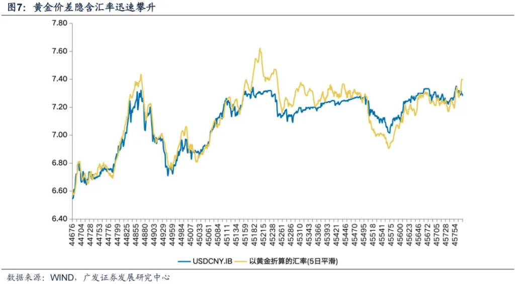 黄金的定价逻辑很可能正在改变:黄金体系不再是美元体系的附庸,而是逐渐成为与美元分庭抗礼、甚至取而代之的存在。当前CNY汇率并没有明显的贬值预期(尤其是兑美元方向),CNH-CNY价差也处于正常区间。但黄金境内外价差隐含的USDCNY汇率迅速升至7.4以上。说明,黄金市场隐含汇率的攀升与汇率预期无关,更多是境内资金大幅流入的结果。